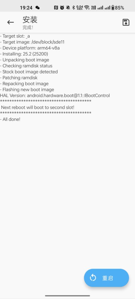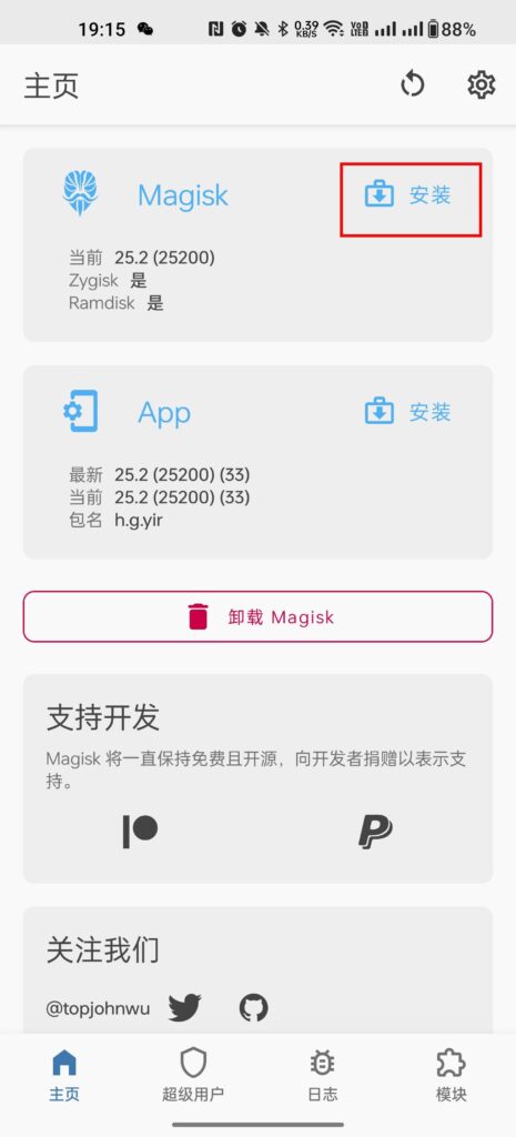 更新成功后, 我们重新进入 Magisk, 右上角的 Magisk -> 安装