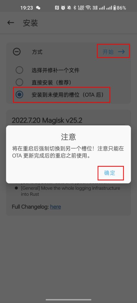 随后选择 “安装到未使用的槽位 (OTA 后)” -> “开始”