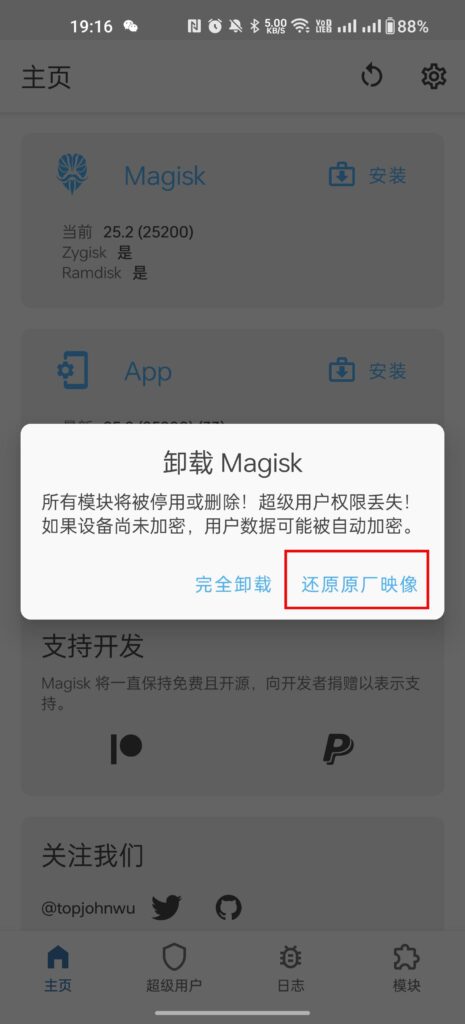 在更新之前, 打开 Magisk, 选择 “卸载 Magisk” -> “还原原厂映像”