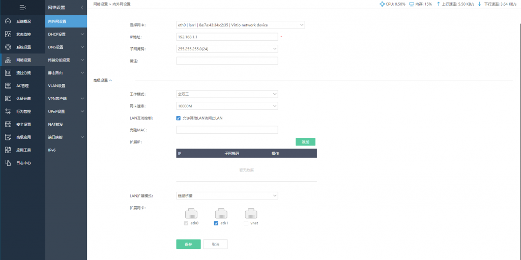 5.爱快(ikuai)设置lan口时有个“高级选项”,点开,把需要规划为lan的网卡都打上勾就行