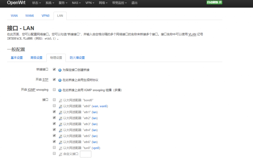 网络-接口-lan-物理设置,把所有需要当成lan的网卡勾在一起就行了